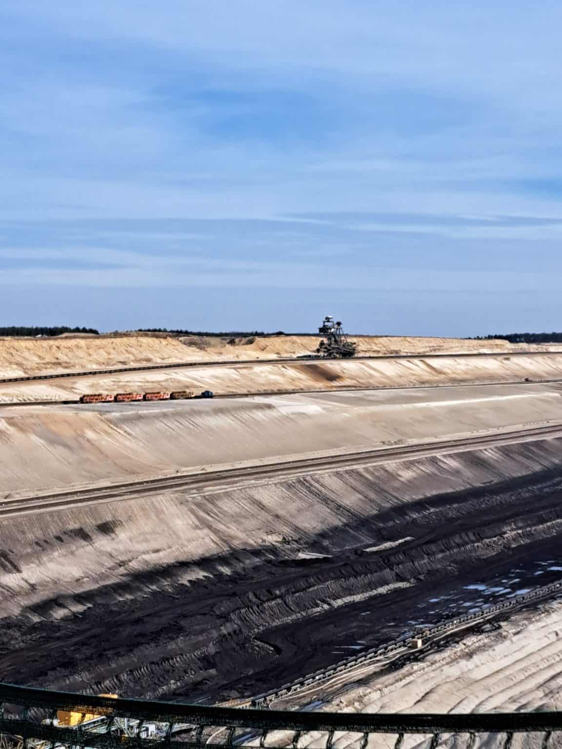 Alt-Text: Großes Bergbaugebiet mit Abraumhalden und Förderanlagen unter blauem Himmel.